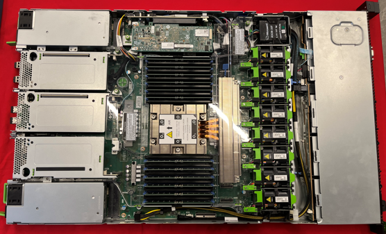 - Po lewej stronie (z tyłu obudowy) widać dwa zasilacze hot-swap (z zielonymi uchwytami).
