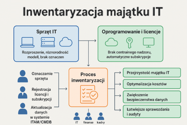 Inwentaryzacja majątku IT to jedno z kluczowych zadań w jednostkach budżetowych – od szkół i uczelni, przez urzędy gmin i powiatów, po szpitale. Choć proces ten może wydawać się prosty, w praktyce napotyka szereg wyzwań, które wpływają zarówno na efektywność pracy, jak i na prawidłowe zarządzanie finansami jednostki. Majątek IT obejmuje nie tylko sprzęt komputerowy, serwery, macierze dyskowe, urządzenia sieciowe, zasilacze awaryjne czy kable, ale także licencje oprogramowania, subskrypcje SaaS/PaaS i rozwiązania chmurowe.